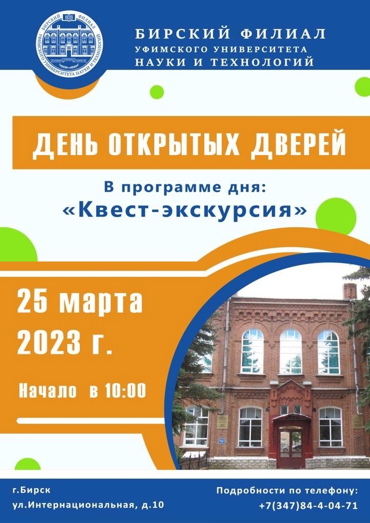 Бирский филиал Уфимского университета науки и технологий приглашает будущих абитуриентов на День открытых дверей, который состоится 25 марта 2023 г. в 10.00 ч.