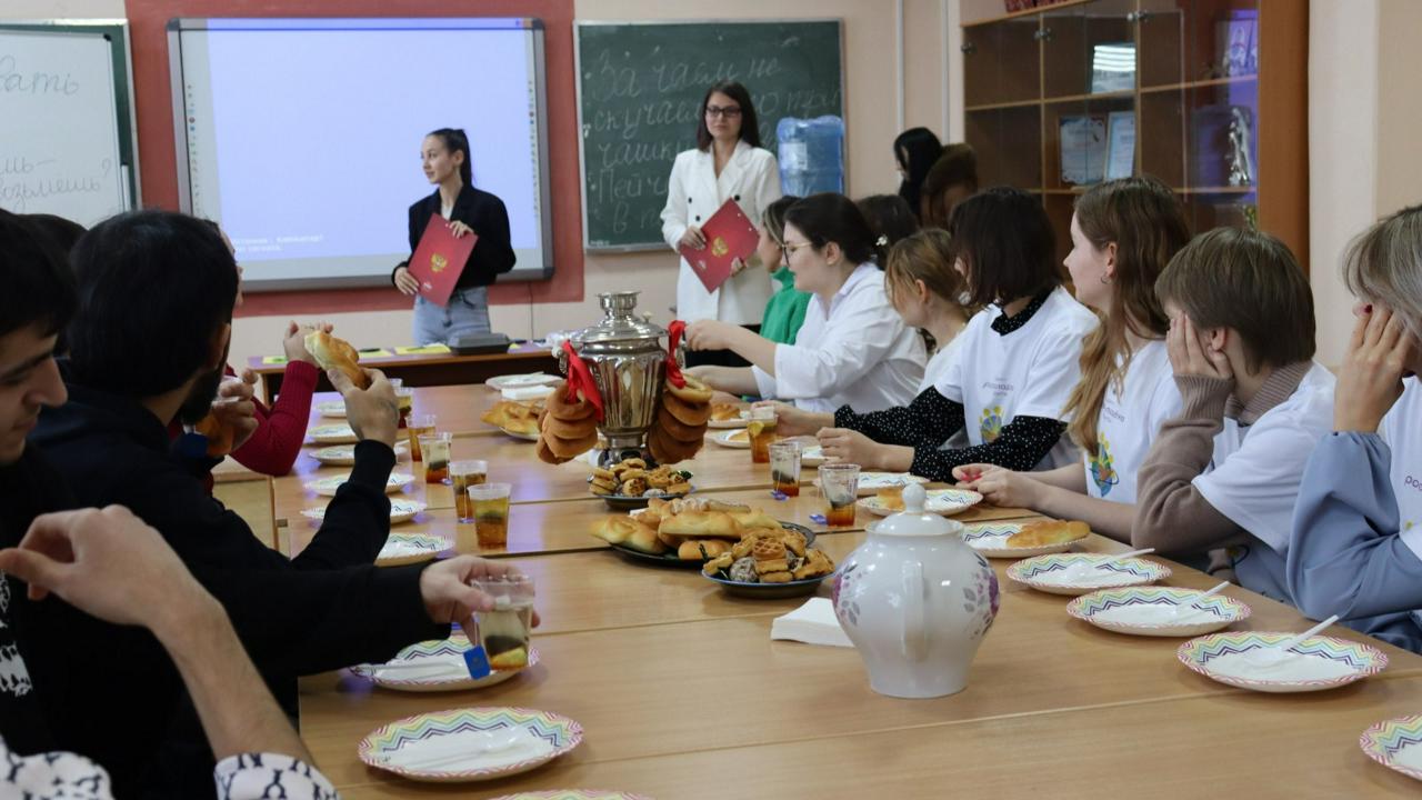 За красиво оформленным столом с русским самоваром и традиционными русскими угощениями участники встречи, следуя русской пословице: «За чаем не скучаем - по три чашки выпиваем», знакомились с особенностями русской кухни.