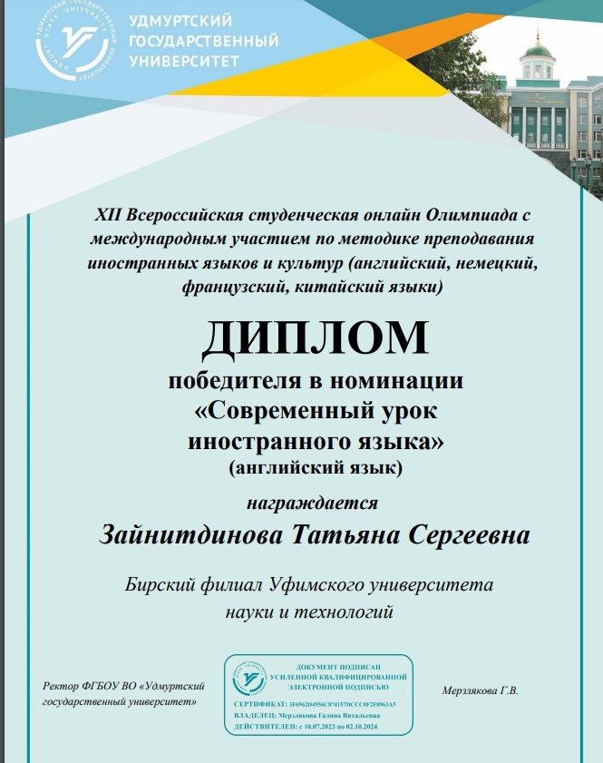 Это было непростое состязание, но Татьяна успешно прошла все этапы до финала и под руководством старшего преподавателя кафедры РГФиЛ БФ УУНиТ Салиной Анастасии Сергеевны подготовила урок. Студентка получила бесценный опыт и была награждена дипломом победителя в номинации «Современный урок английского языка».