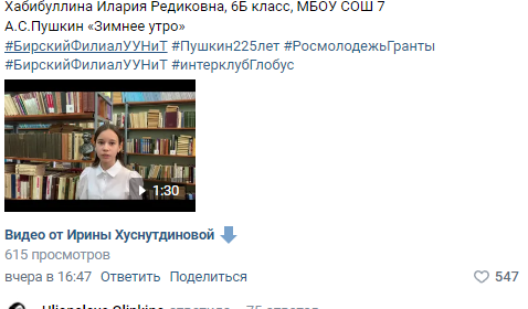 Чуть меньше голосов (547) получила Хабибуллина Илария, ученица 6Б класс, МБОУ СОШ №  7 г. Бирска, которая исполнила стихотворение А.С.Пушкин «Зимнее утро» (руководитель учитель русского языка и литературы Хуснутдинова И.М.) (2 место)