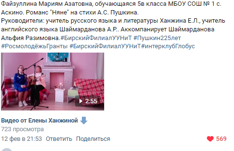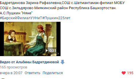За необычное исполнение стихотворения А.С. Пушкина «Няне» в стиле  рэп  Бадретдиновой Зариной, ученицей СОШ с.Шатмантамак-филиал МОБУ СОШ с.Зильдярово Миякинского района Республика Башкортостан, проголосовало 195 участников (3 место).